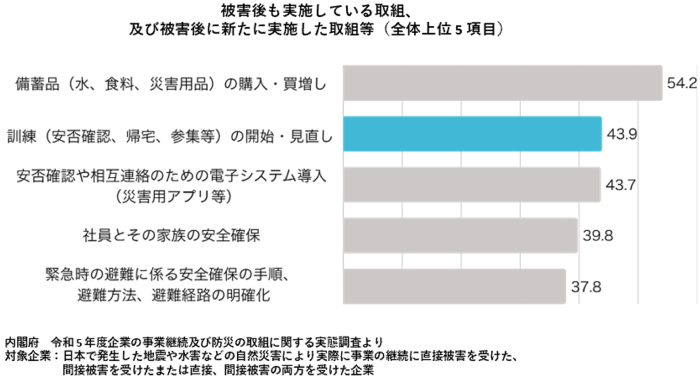 政府調査では、自然災害により直接・間接的に事業継続の被害を経験した企業の43.9%が「安否確認や参集などの訓練の開始・見直し」を重要な取組として被災後に実施。BCPを活かす鍵は、模擬訓練や計画策定後の有効性確認です。