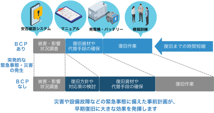 BCP(事業継続計画)とは、単に災害対策設備を導入するだけでなく、突発的な緊急事態や災害発生時にも事業を中断させず、重要な業務を継続・早期復旧を目指すための計画です。
