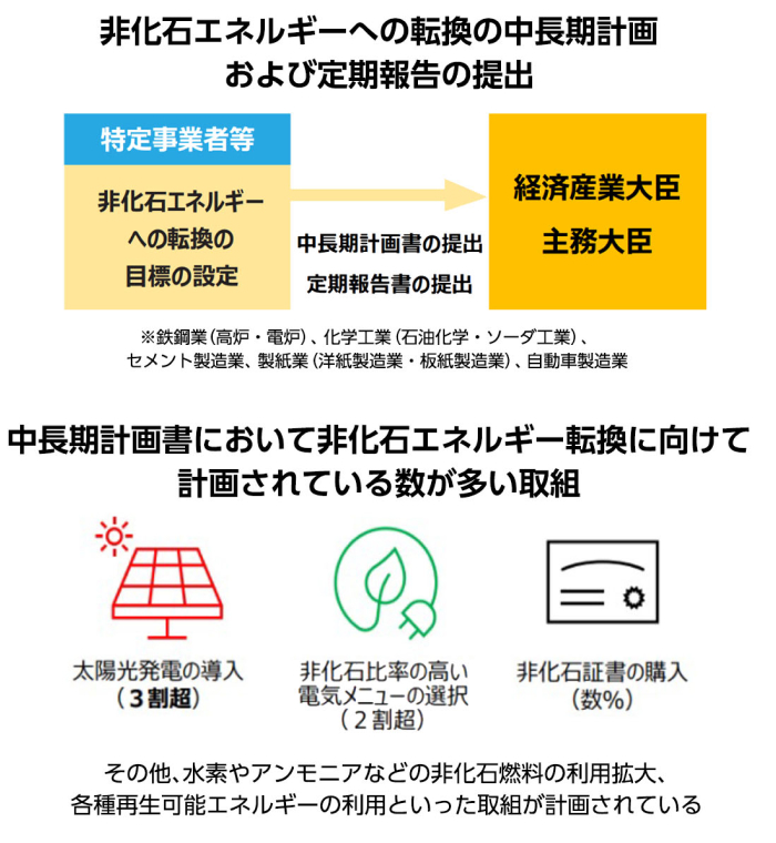 2050年のカーボンニュートラル達成には、エネルギーを使用する需要側のエネルギー非化石化が重要です。特定事業者は省エネ法において、非化石エネルギーへの転換の目標に関する中長期計画の作成及び使用状況等の定期報告が求められ、2024年度からは事業者の同意に基づく開示制度の本格運用が開始されています。太陽光発電の導入を中長期計画で作成したものの、コスト面やメンテナンス人材不足などでお悩みの場合、PPA方式での導入が最適です。九電グループでは、国や自治体の補助金活用を含め、太陽光発電の導入をサポートします。